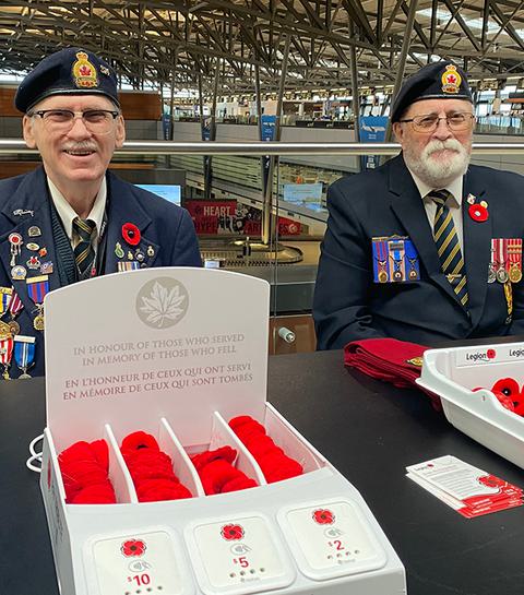 Les deux anciens combattants qui font du bénévolat à YOW depuis de nombreuses années, Ian Burleton et Roy Blair, acceptent encore une fois avec plaisir les dons au Niveau 3, près du Tim Hortons - et pour la première fois à l'Aéroport, vous pouvez faire un don en tappant (2 $, 5 $ ou 10 $) pour obtenir un coquelicot.