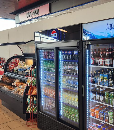 Les voyageurs peuvent y déguster des sandwichs et des sushis fraîchement préparés, des collations et des boissons (y compris des boissons alcoolisées).